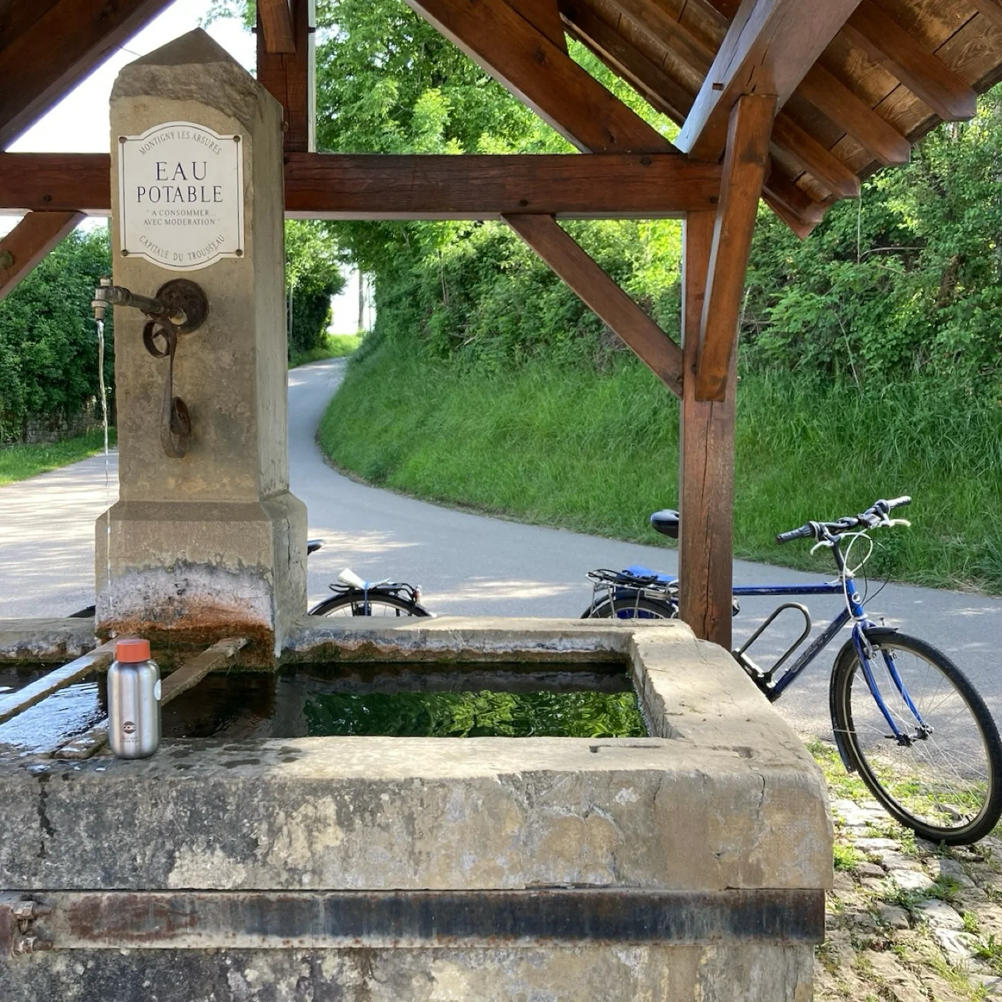 Une pause près d’une fontaine dans le hameau de Montigny-les-Arsures dans le Jura (mai 2024).